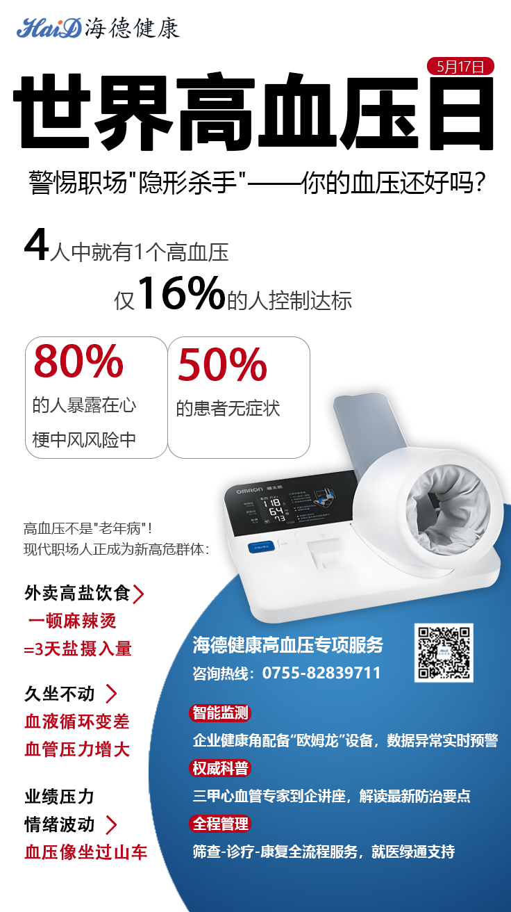 高血压可防可控,关键在于早发现、早干预、长期管理。海德健康将持续提供员工健康福利服务,也希望大家主动关注自身血压健康,共同打造“健康职场”。
