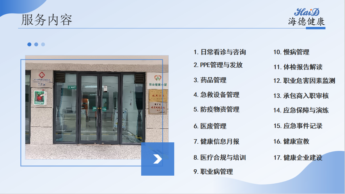 在很多人的印象里,企业医务室或健康小屋可能只是一个“量量血压、发发感冒药”的简单存在。那里的医生,似乎工作清闲,无非是坐等员工上门,处理些小伤小病。然而,当我们真正走进他们的工作清单,比如上面这张来自海德健康为某大型企业服务的医务室的服务内容表,才会恍然大悟:原来,这一方小小的健康天地背后,竟承载着如此繁多而重要的职责。企业健康守护者们的工作,远比我们想象的更复杂、更立体。