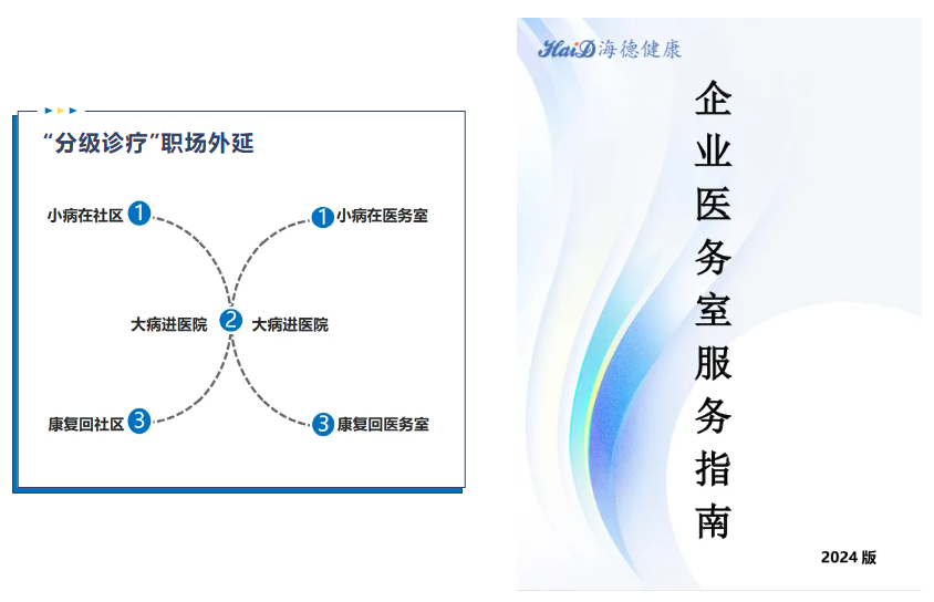 海德健康正是看到了这一社会问题与市场需求,率先将“分级诊疗”模式引入职场(获“人民日报·人民康养”报道),提出了“小病在企业医务室、大病去医院、康复回企业医务室”的职场健康管理新思路,形成闭环健康管理。